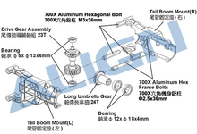 ●700X Tail Boom Mount(L) x 1 ●700X Tail Boom Mount(R) x 1 ●700X Aluminum Hexagonal Bolt x 3(M3x36mm) ●700X Aluminum Hex Frame Bolts x 2(Φ2.5x36mm) |