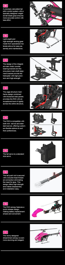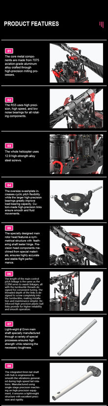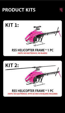 The RS5 can accommodate 550 to 600mm blades, using 12mm main shaft and 6mm tail shaft and 30mm tail boom for rigidity. Battery tray is slide in to fit under the main frame.
